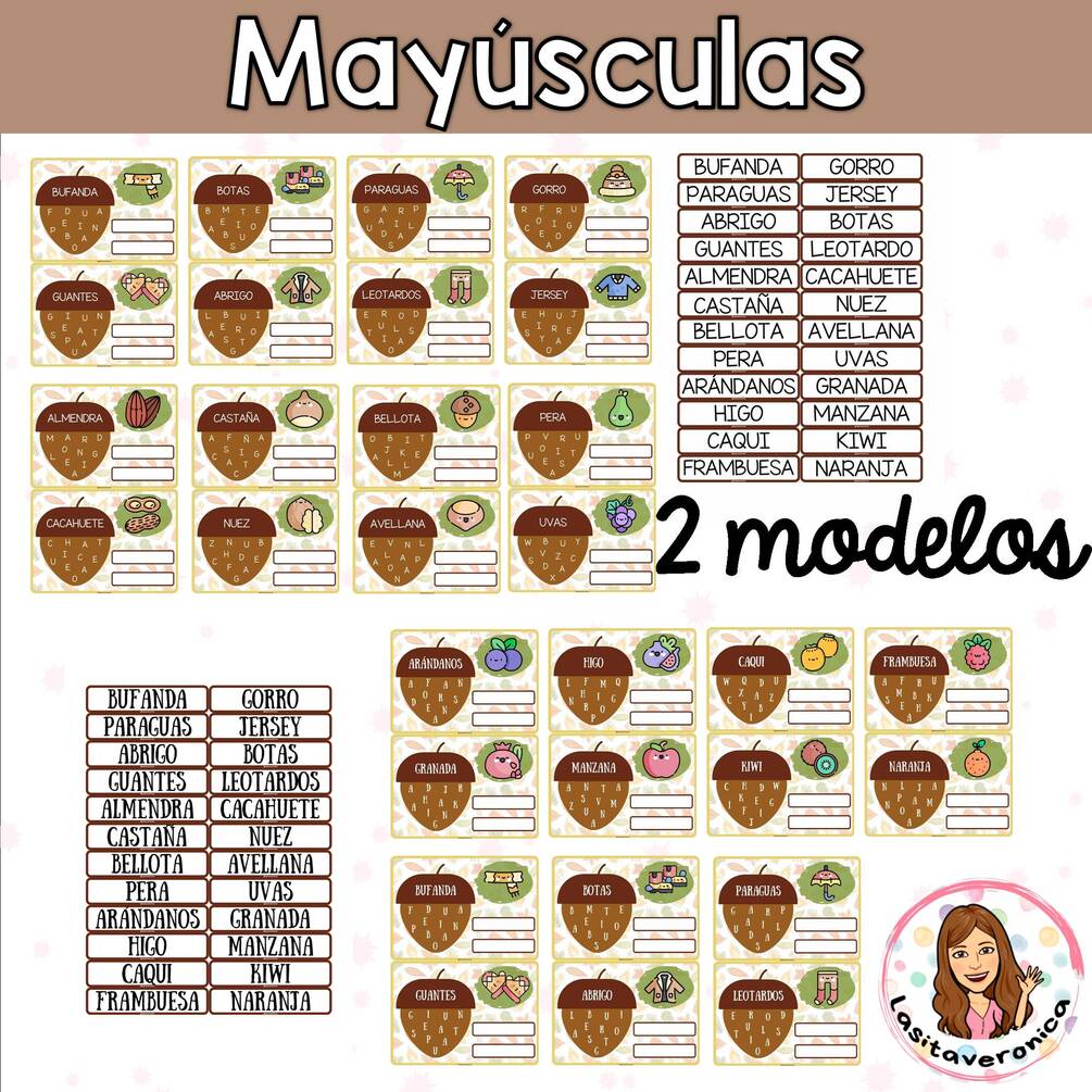 Contenido: 96 tarjetas, a color, para trabajar un total de 24 palabras, relacionadas con la ropa de otoño y con las frutos secos y carnosos.