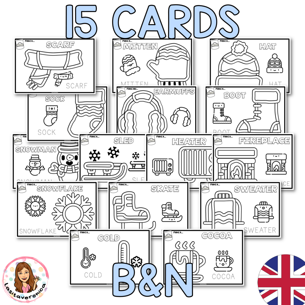 Contents: Includes 15 cards with 15 different reproductions of Winter elements: scarf, hat, mitten, sock, earmuffs, boot, snowman, sled, heater, fireplace, snowflake, skate, sweater, cold and cocoa.