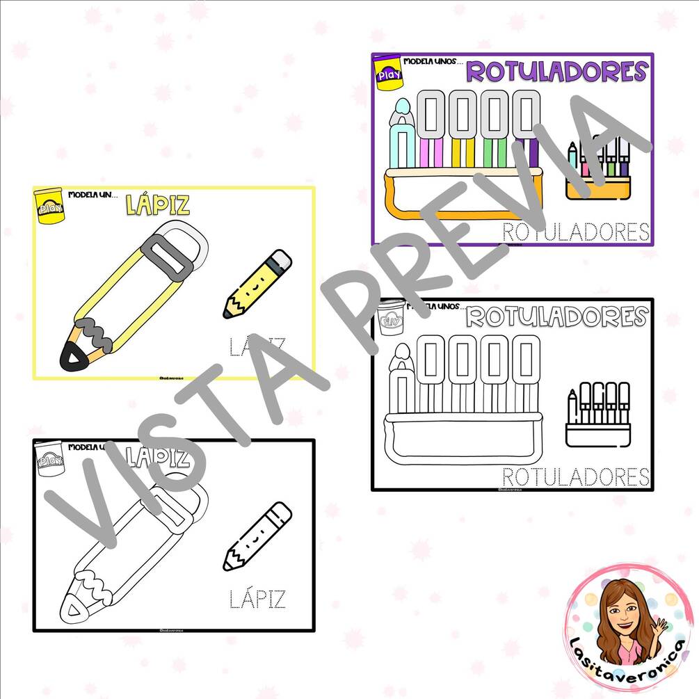 Las plantillas se encuentran a color y en blanco y negro, sumando un total de 16 tarjetas. Su tamaño es A4 pero puede ajustar su impresora para imprimir a un tamaño menor. Igualmente, incluye el nombre de cada imagen, en letra normal, para poder construirla también usando plastilina, y con letra punteada, para reseguir.