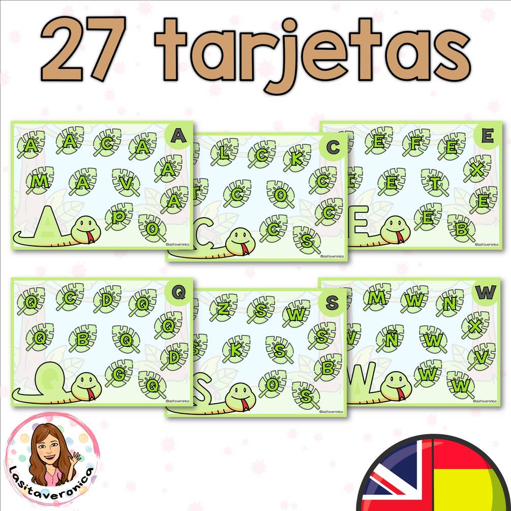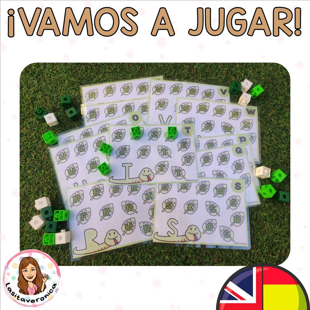 Divertido juego de lectoescritura para trabajar la identificación de letras, la discriminación visual y el reconocimiento de letras mayúsculas. Los estudiantes tendrán que buscar en su plantilla las letras del abecedario en mayúsculas que se ha comido la serpiente y taparlas, tematizado en África, la jungla y el zoo. Para jugar podrán usar pompones, policubos, minigomas, contadores, fichas del parchís etc...