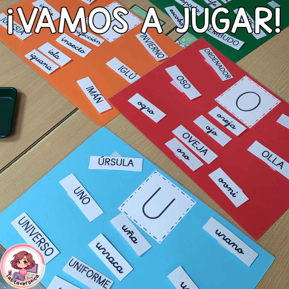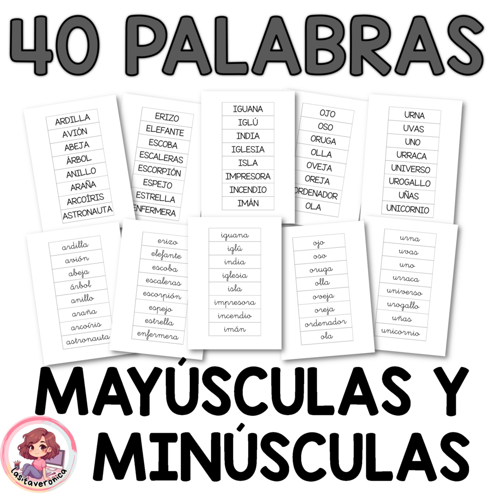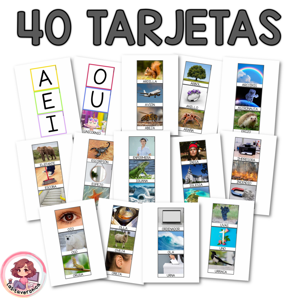 - 8 palabras en mayúsculas y minúsculas, para cada vocal, sumando un total de 40 tarjetas de palabras.