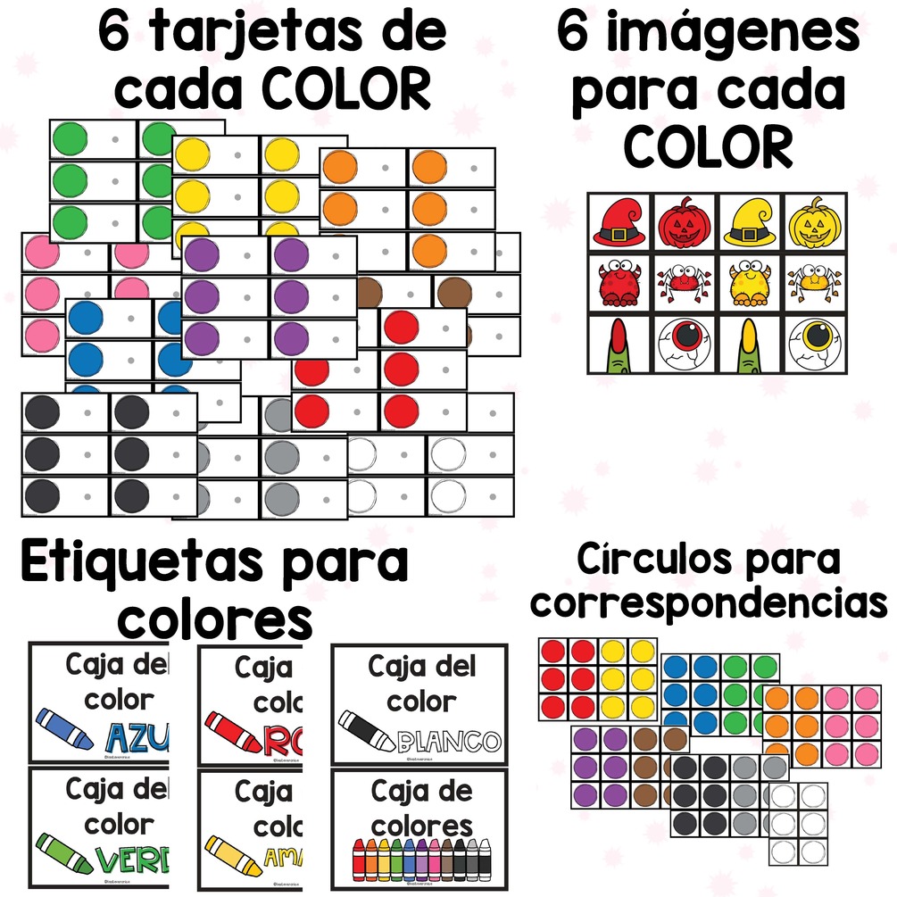 Contenido: 66 tarjetas para trabajar 11 colores diferentes, 6 imágenes relacionadas con Halloween de cada color y 6 imágenes de círculos de cada color para realizar correspondencias semejantes.