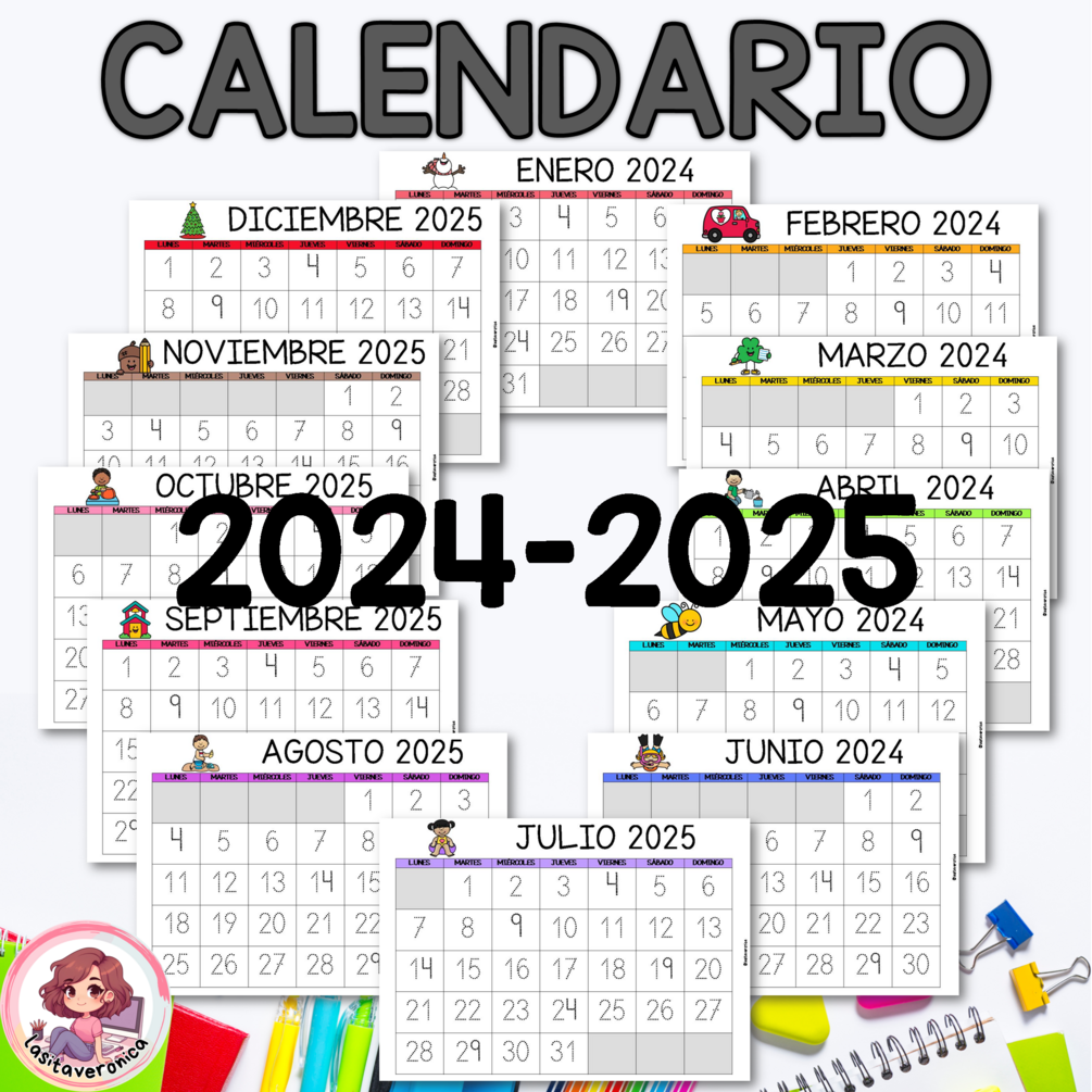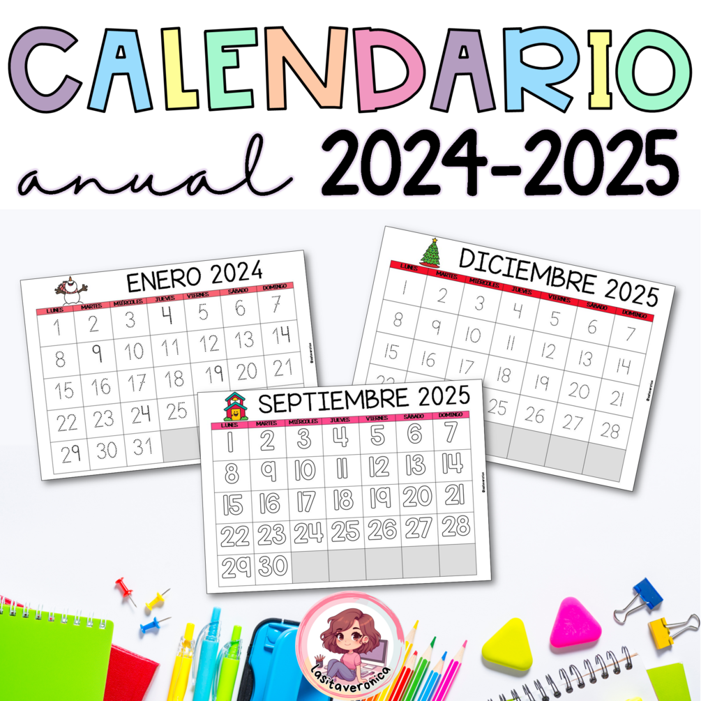 Contenido: Este material incluye 3 modelos de calendario 2024 y 2025, a color y en blanco y negro: