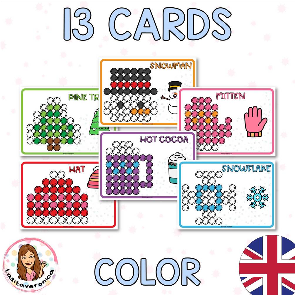 Contenido: Incluye 13 tarjetas con 13 elementos dieferentes propios del invierno: pino, guante, gorro, muñeco de nieve, taza de chocolate, copo de nieve, trineo, patín, calcetín, cacao y croissant, iglú, oso plar y pingüino.