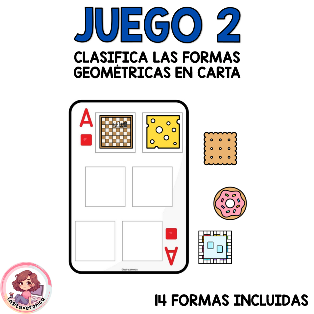 - JUEGO 2: Incluye 14 tarjetas para clasificar las formas geométricas de elementos en 2D y 6 elementos por cada forma geométrica.