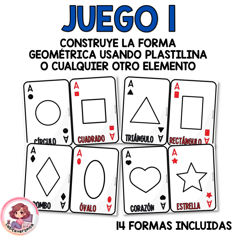 - JUEGO 1: Incluye 14 tarjetas individuales, con 14 formas geométricas de CARTAS DE NAIPES: círculo, cuadrado, triángulo, rectángulo, óvalo, rombo, estrella, corazón, pentágono, hexágono, octógono, trapezoide, paralelogramo y luna. Estas tarjetas las encontrarás en tamaño A5.