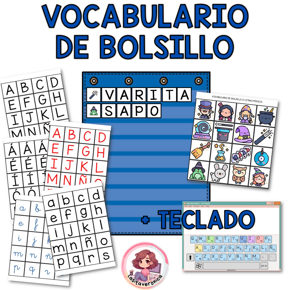 - Vocabulario de bolsillo o de letras móviles, con plantilla de letras en color negro, rojo y azul, además de incluir las vocales con las tildes, mayúsculas y minúsculas.