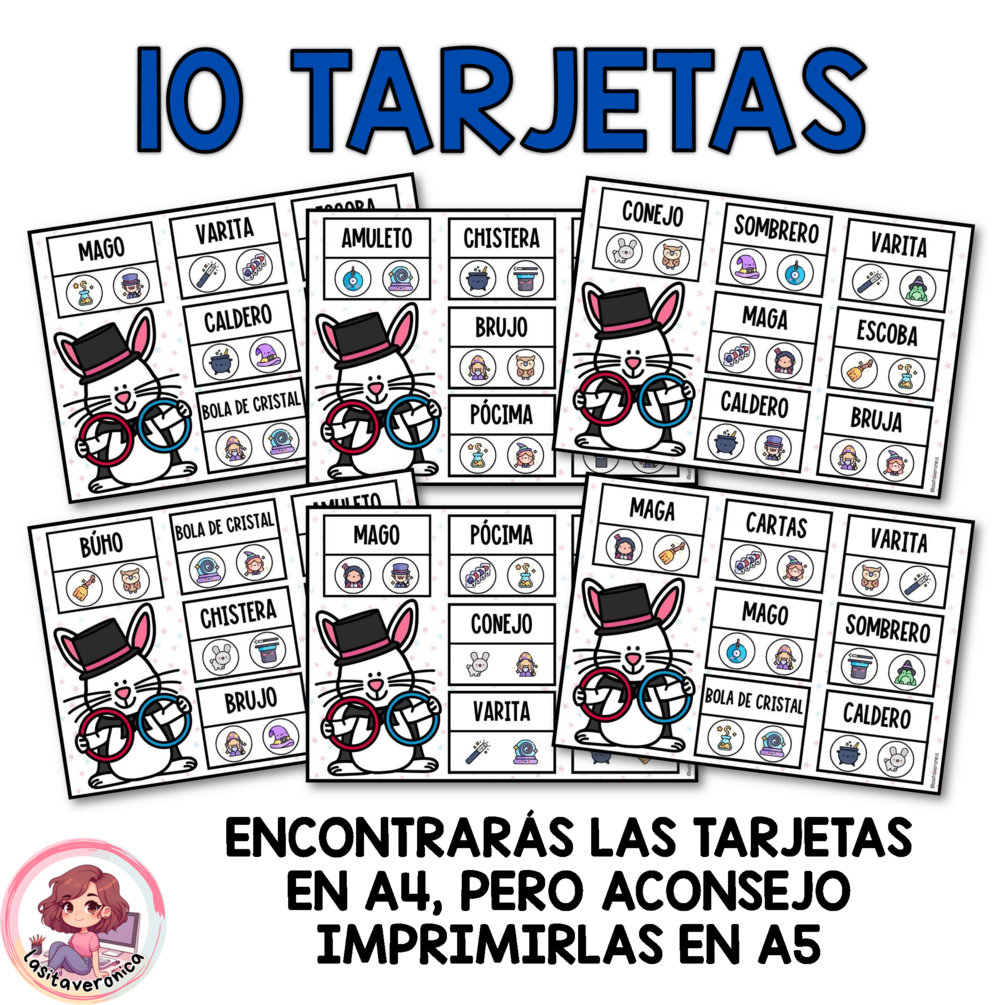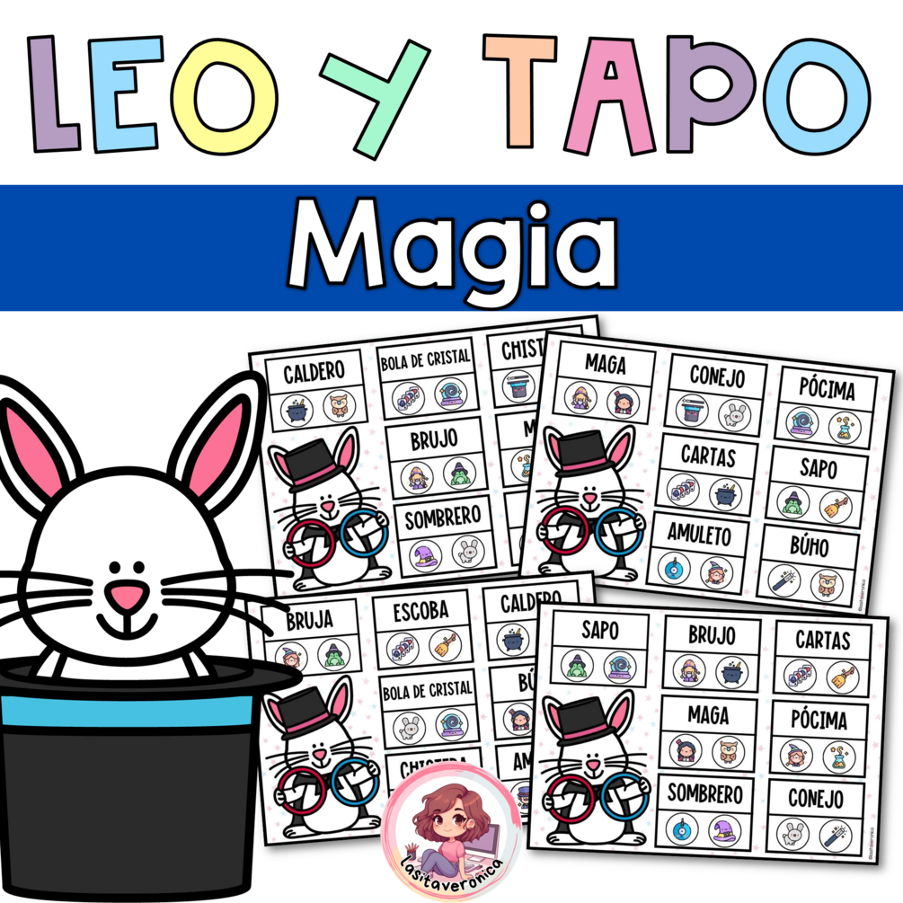 Contenido: Incluye 10 tarjetas de lectura, con las que trabajaremos 15 palabras relacionadas con la magia. Para su uso necesitarás fichas/objetos para tapar.