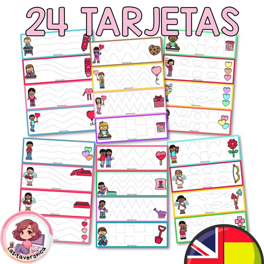 Contenido: Incluye 24 tarjetas con 12 trazos diferentes, relacionados con elementos de SAN VALENTÍN.